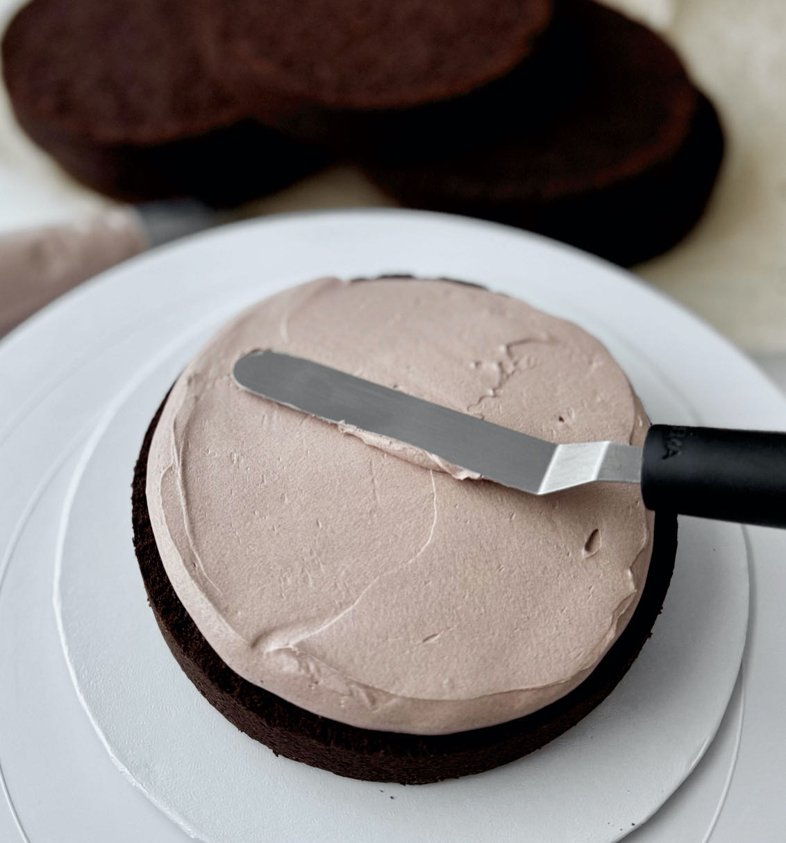 Comenzamos con el montaje de la primera tarta. Sobre una base giratoria colocamos el primer disco de bizcocho el cual a su vez está colocado sobre una base de tarta de cartón fino. Humedecemos ligeramente con el almíbar y extendemos una capa generosa de trufa. Colocamos el segundo disco de bizcocho y repetimos operación hasta terminar con todos.