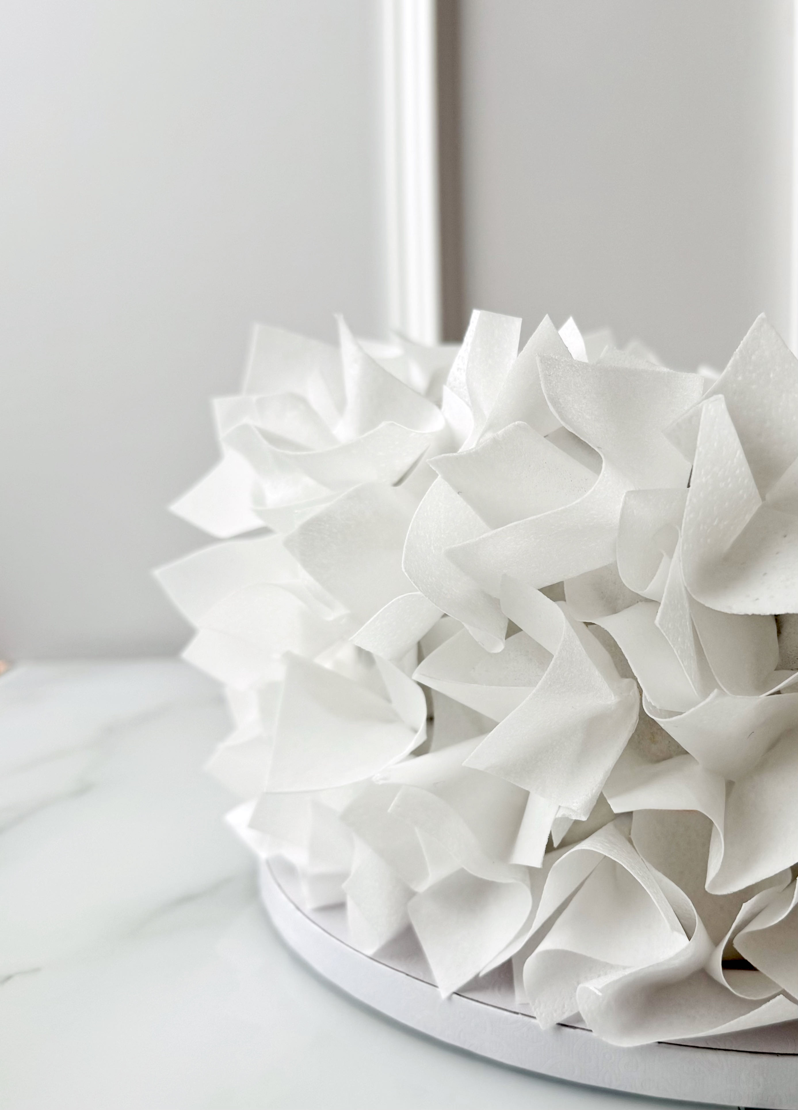Para la decoración de la țarta inferior vamos a utilizar obleas de papel de arroz. Cortaremos unos cuadrados de 6 x 6 cm. Estas obleas son como las hostias consagradas que tomábamos en la comunión, os acordáis? son muy rígidas y para trabajarlas hay que humedecerlas muy muy ligeramente porque de lo contrario se deshacen. Os cuento como lo hice yo. Colocamos el cuadrado de oblea sobre un paño de algodón limpio, en la parte izquierda. La parte derecha del paño la humedecemos ligeramente con agua con ayuda de un spray. Ahora, superponemos la parte húmeda durante un segundo sobre la oblea para humedecerla e inmediatamente le damos forma. Este movimiento ha de ser muy rápido. Dejamos secar. Podemos dejarlas hechas el día anterior.