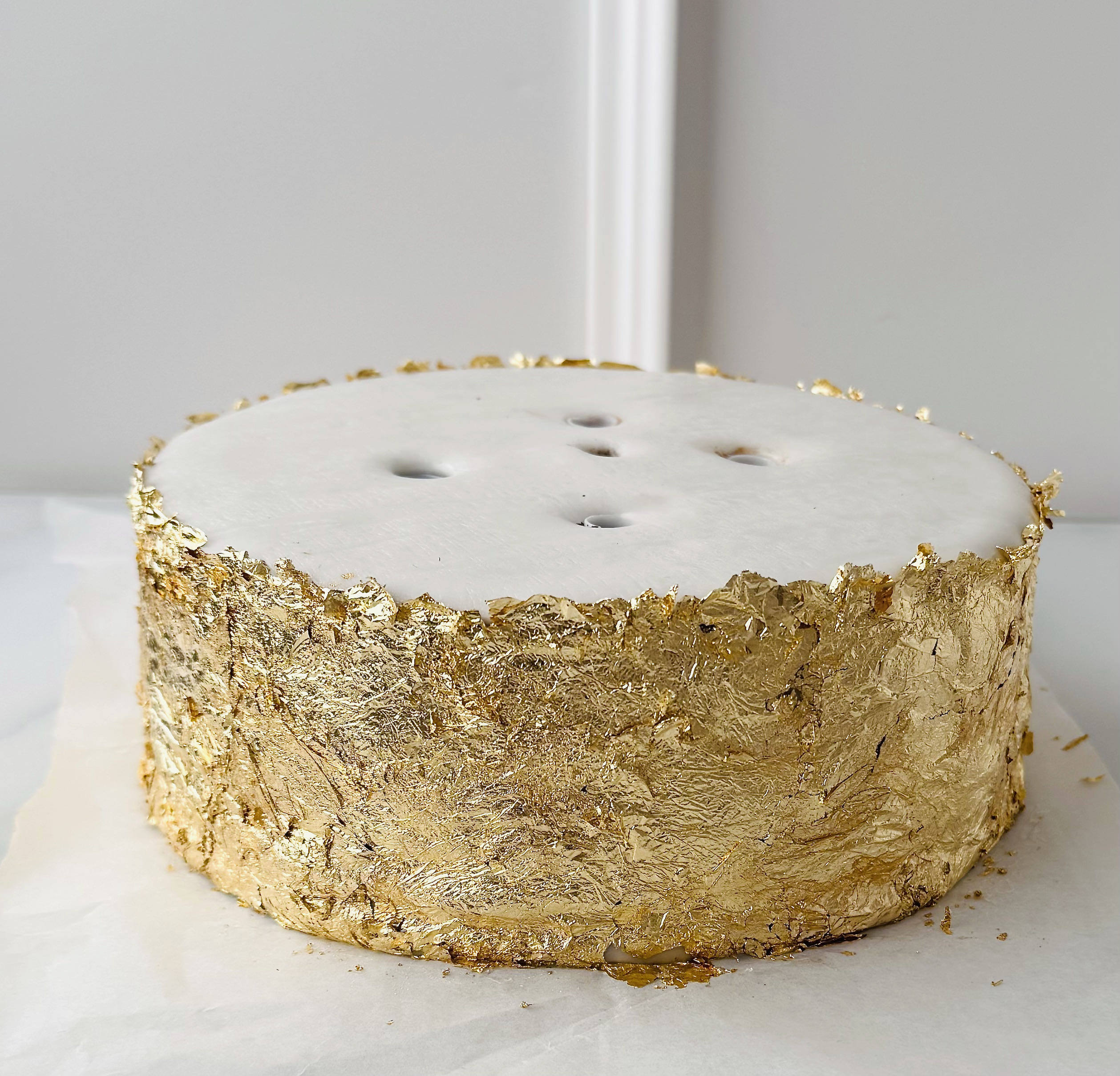 Utilicé papel de oro comestible. Esta lámina hiper-mega fina es una fantasía para mí, me encanta. No tiene sabor, se utiliza únicamente con fines decorativos. La pega que tiene es que es delicado y a la hora de utilizarlo es mejor no tocarlo con las manos para que no pierda integridad. Se aplica con ayuda unas pinzas de repostería o con un pincel mojado ligeramente en agua o en pegamento comestible. Iremos pegando trocito a trocito hasta tener todo el lateral cubierto. Y sí amigos…. esto pone a prueba la paciencia de uno, pero poquito a poquito se va cubriendo.
