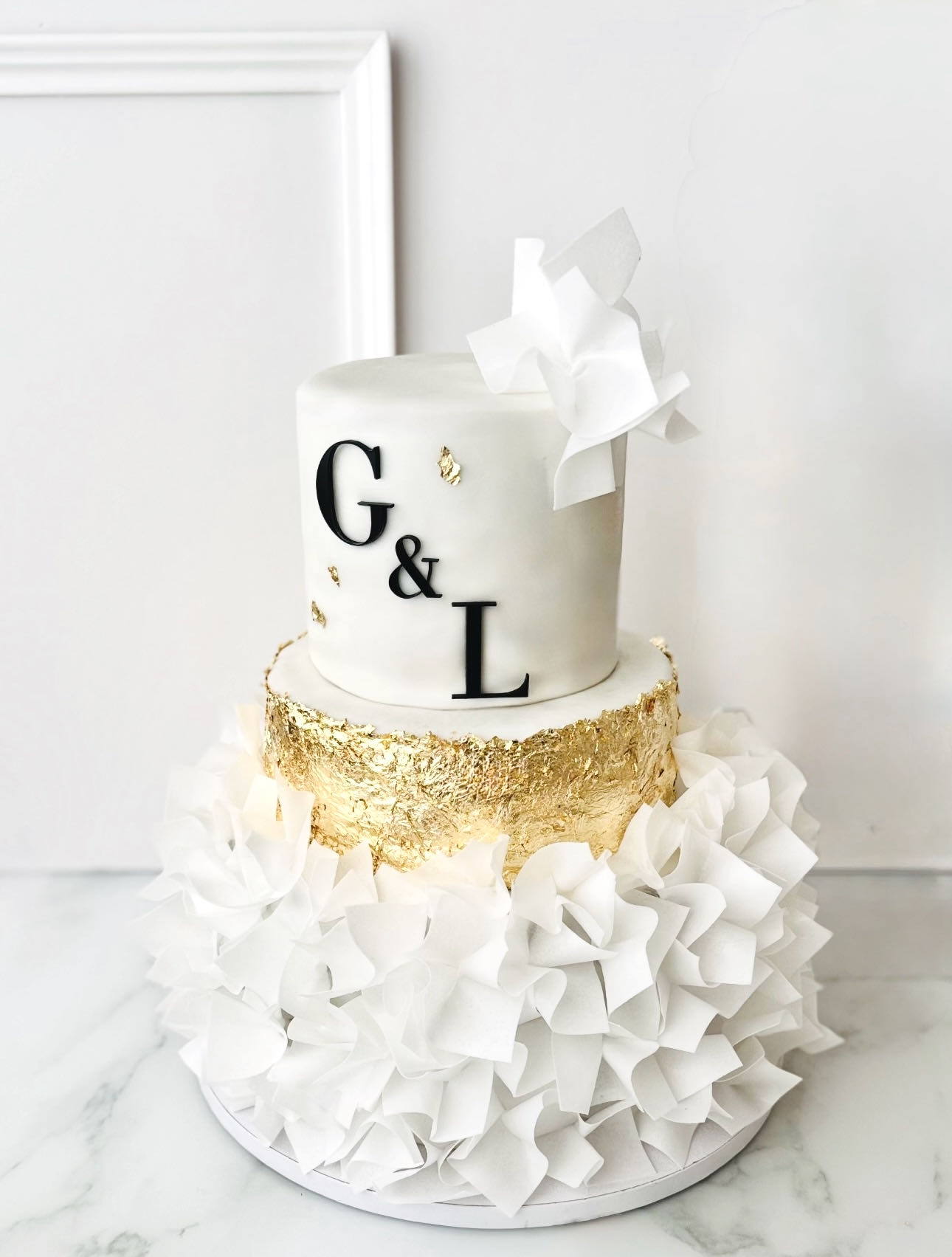 Finalmente apilamos las tres tartas y terminamos de decorar la superior pegando en el frontal las letras de metacrilato con un pelín de agua así como unos trocitos de papel de oro y colocando tres figuritas del papel de arroz.