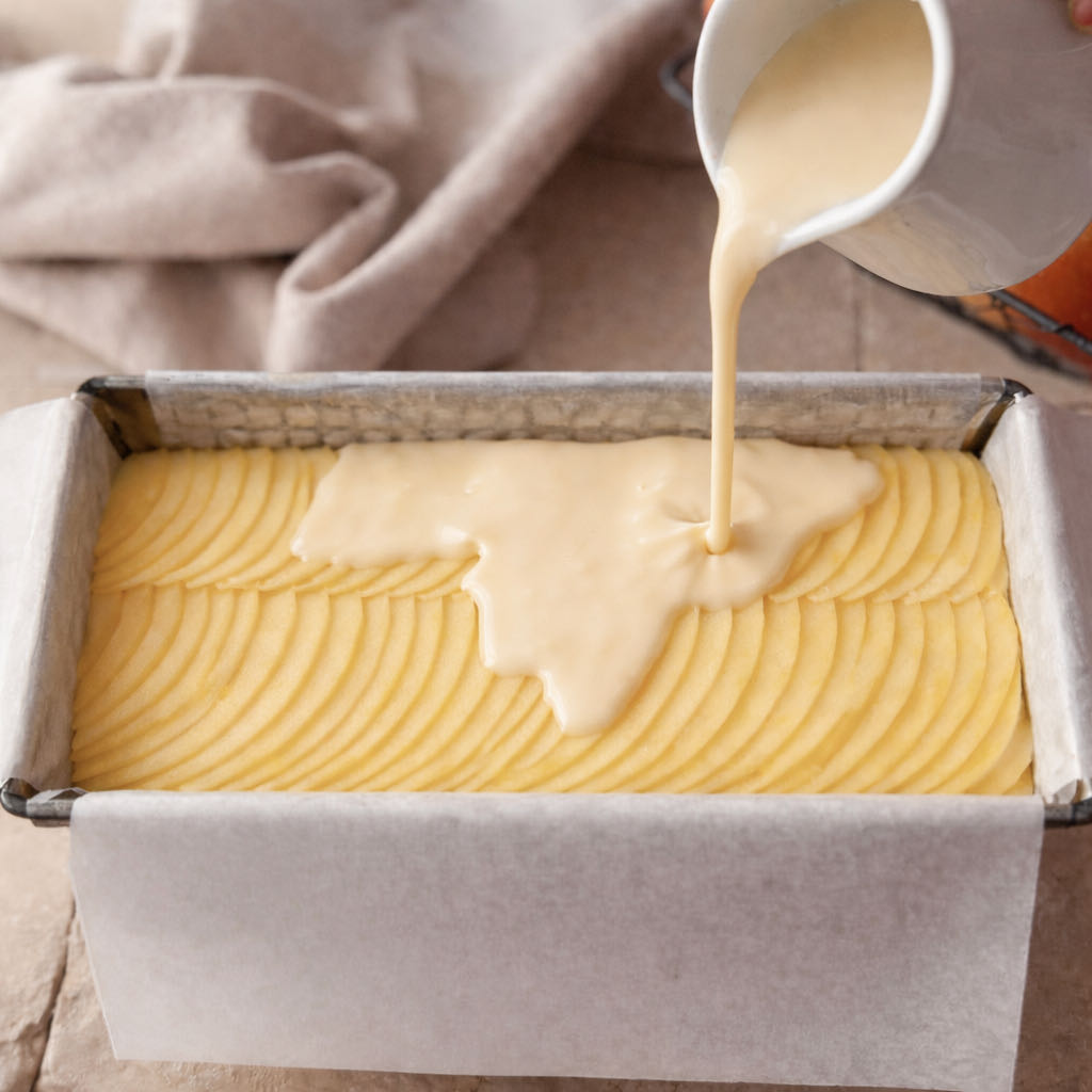Preparamos una masa ligera batiendo el huevo, el azúcar, la leche, la harina tamizada, la mantequilla derretida fría y las especias. Ponemos 1/3 parte de la masa en la base y reservamos el resto.