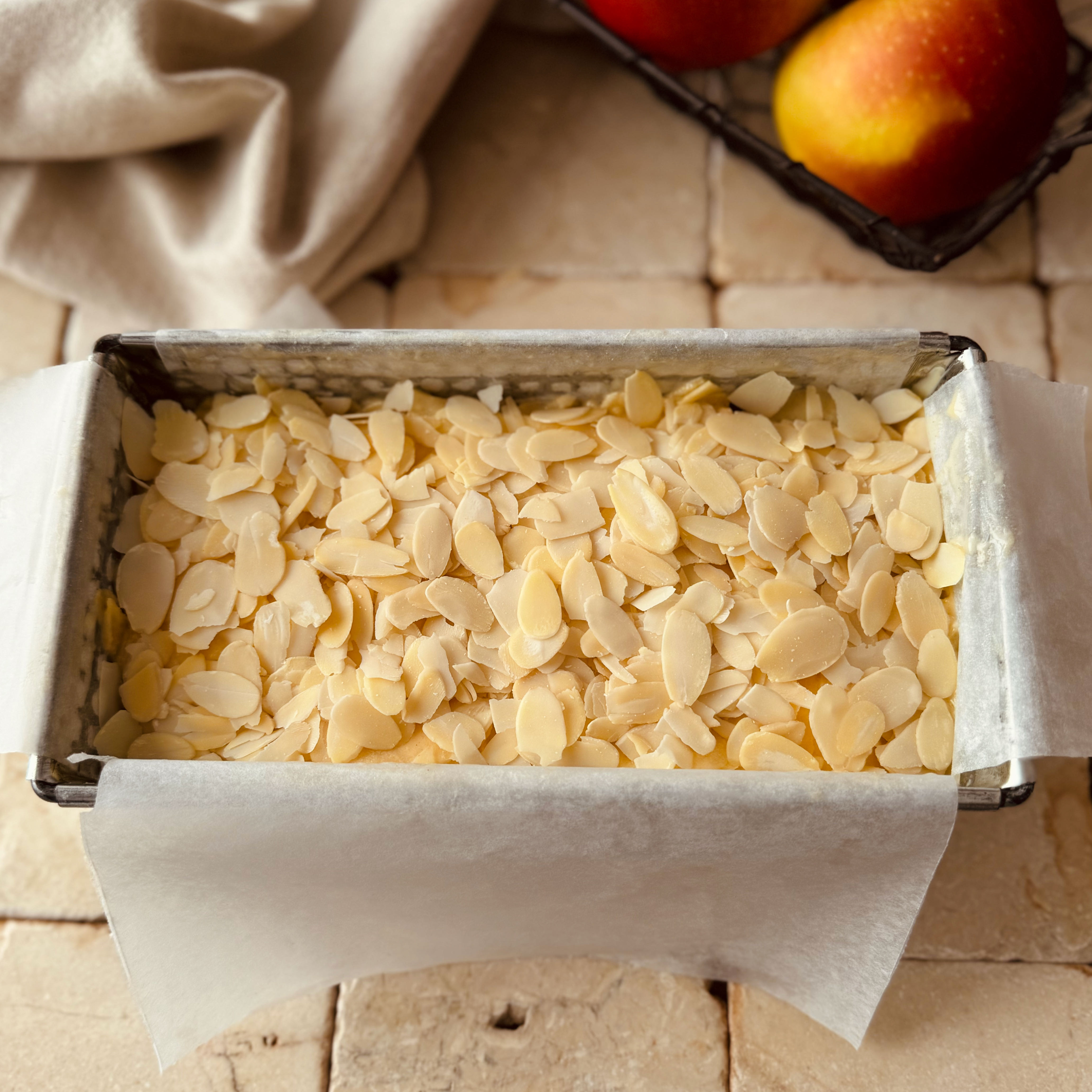 Finalmente, decoramos la superficie con la almendra laminada. Llevamos al horno precalentado con calor arriba y abajo a 180ºC y dejamos cocinar durante unos 50´ o hasta que comprobemos insertando una brocheta que ésta entra con suavidad. Si vemos que se dora en exceso la superficie podemos cubrirla con papel de aluminio.