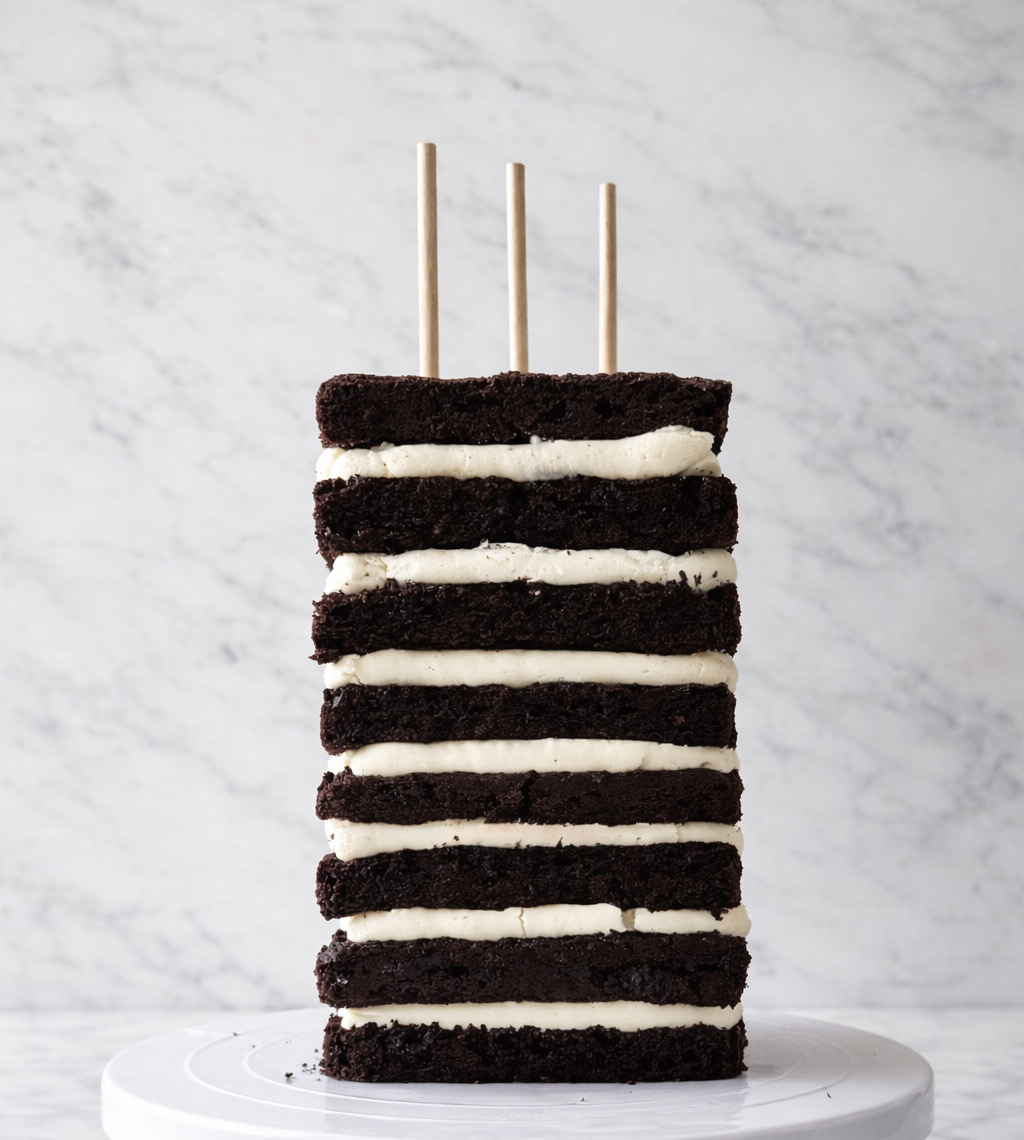 Colocaremos la última a modo de tapa. Insertaremos unos pilares de madera o plástico especiales para repostería para garantizar la estabilidad de la estructura de la tarta ya que al ser una tarta alta hay riesgo de que pueda vencerse, las capas de bizcocho se mantendrán alineadas a la hora de decorarla y sobre todo si hay que transportarla.