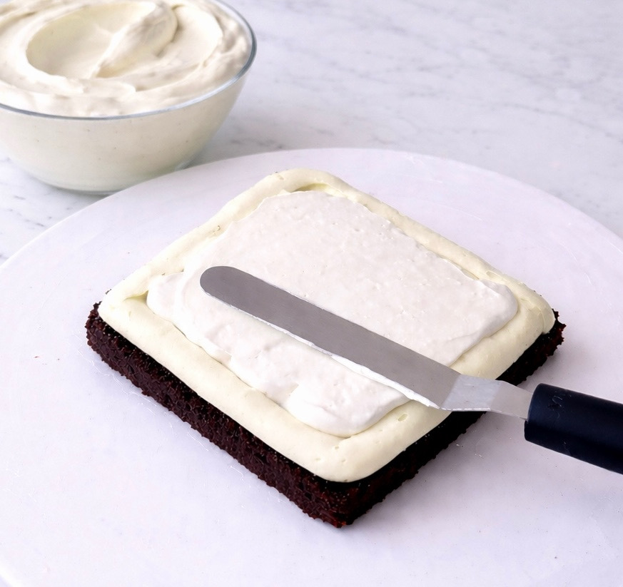 Rellenamos el hueco con la crema de mascarpone y alisamos con una espátula. Colocamos encima la segunda capa de bizcocho y repetimos la operación hasta terminar.