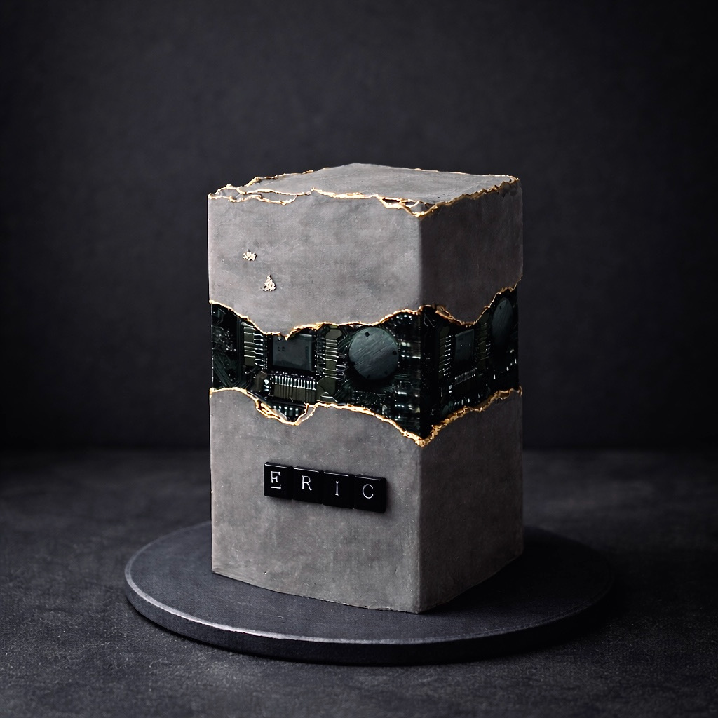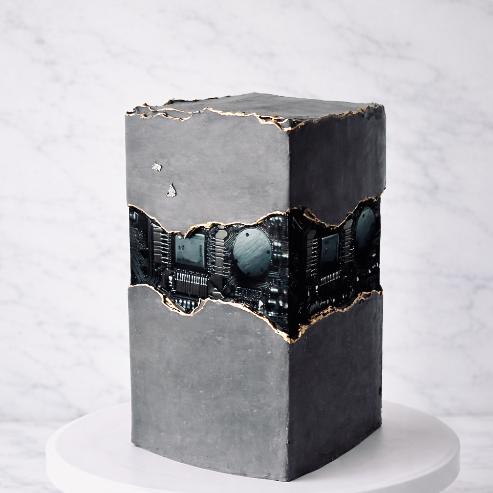 Con motivo de la Festividad de Quintos que cada año se celebra en mi pueblo, le preparé esta tarta personalizada tomando como referencia su afición por la informática. Se trata una tarta Fault Line Cake, la cual se caracteriza por su efecto quebrado. Es una técnica de decoración que simula una grieta rústica dejando ver el interior. En este caso, he querido reproducir una torre de un ordenador, dejando a la vista la placa que se halla en su interior.