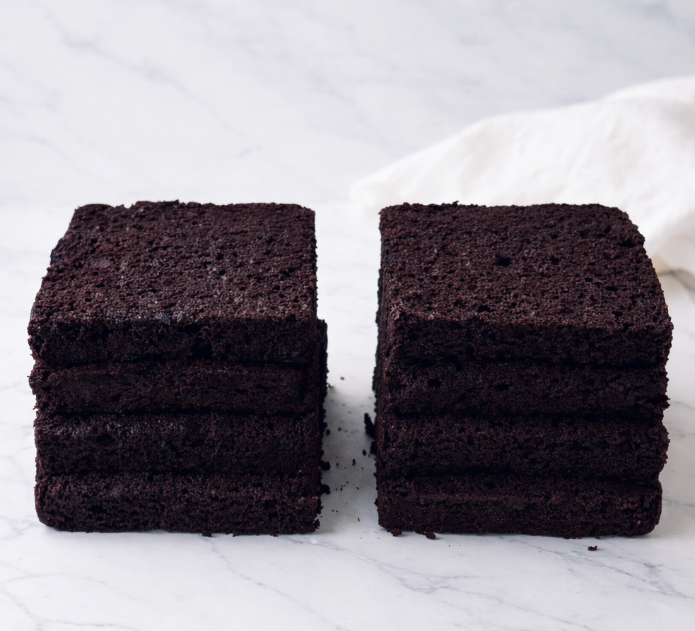 Una vez fríos y con ayuda de una lira cortamos cada bizcocho en cuatro cuadrados de manera que tengan un grosor de unos 2,5 cm de grosor. Envolvemos individualmente en film transparente para que conserven la ternura.