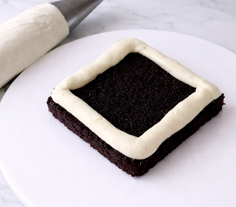 Sobre una base giratoria colocamos la primera capa de bizcocho. Llenamos una manga pastelera con la ganache y hacemos un borde. De esta manera el relleno no se aplastará con el peso evitando así que se salga por los bordes.