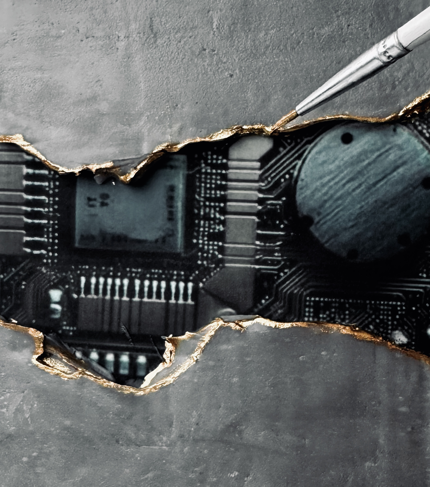 Finalmente vamos a pincelar los bordes de la grieta con el colorante líquido oro metalizado para resaltar la línea de la fractura, le aporta elegancia.
